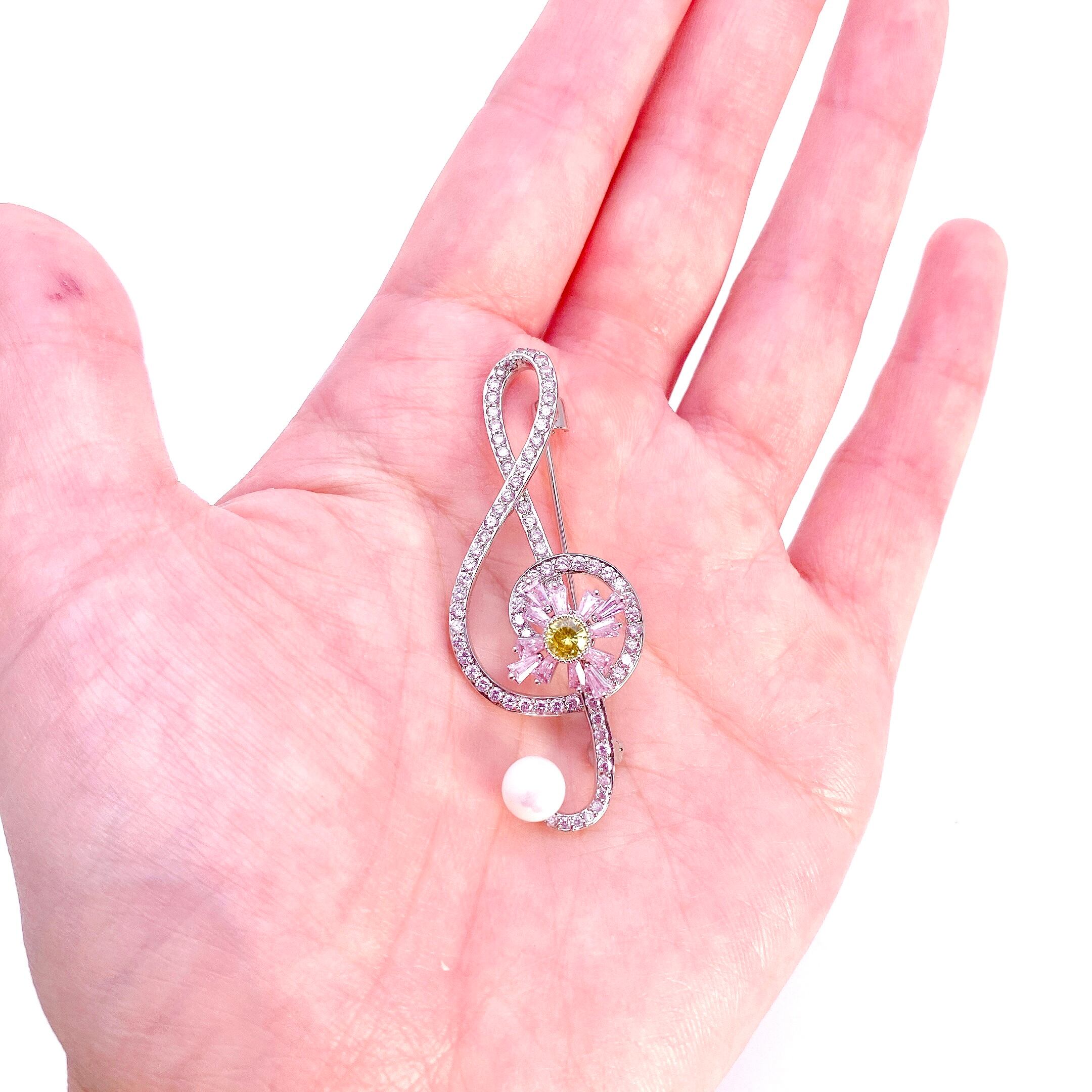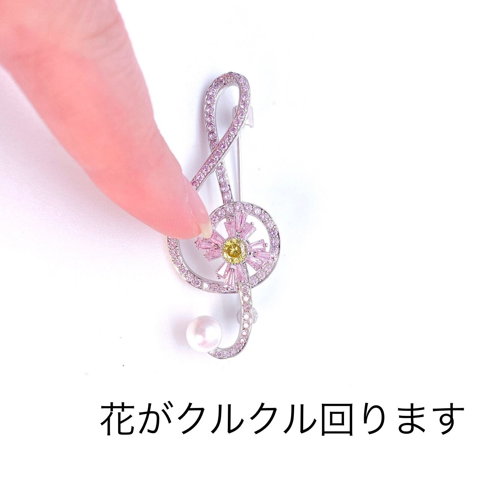 中心の花がクルクル回るト音記号のブローチです。