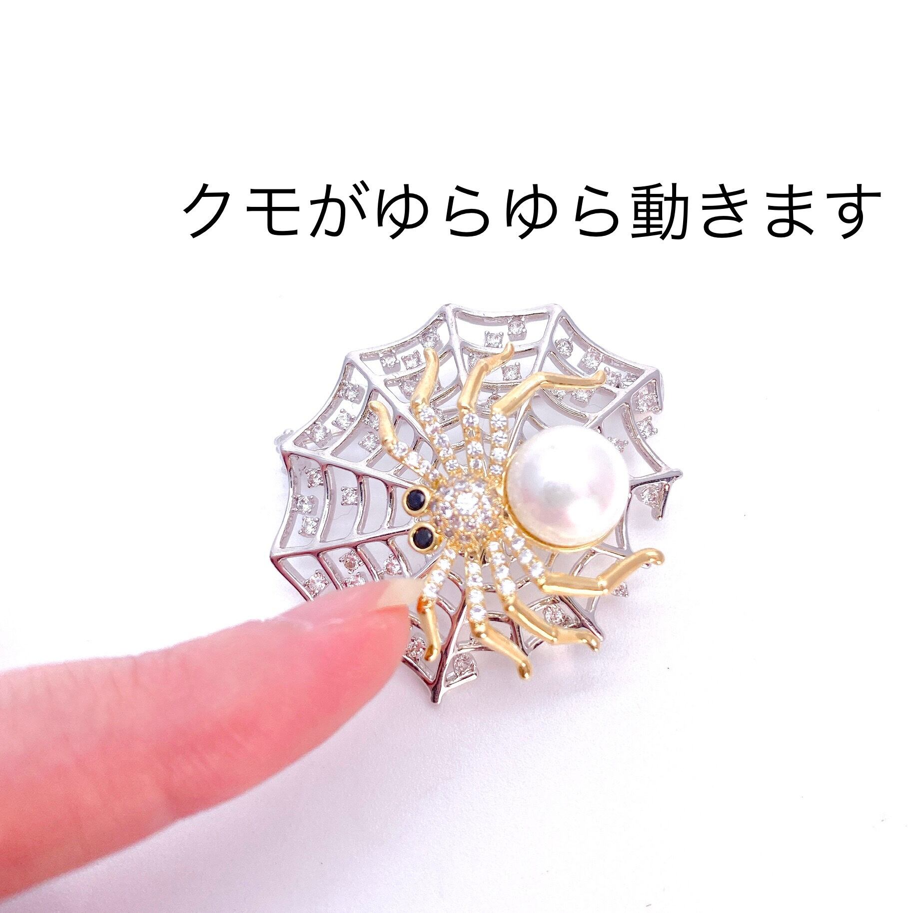 クモがゆらゆら動きます。シルバーとゴールドのコントラストとキラキラストーンで品のある雰囲気に。ハロウインシーズンにもオススメです。