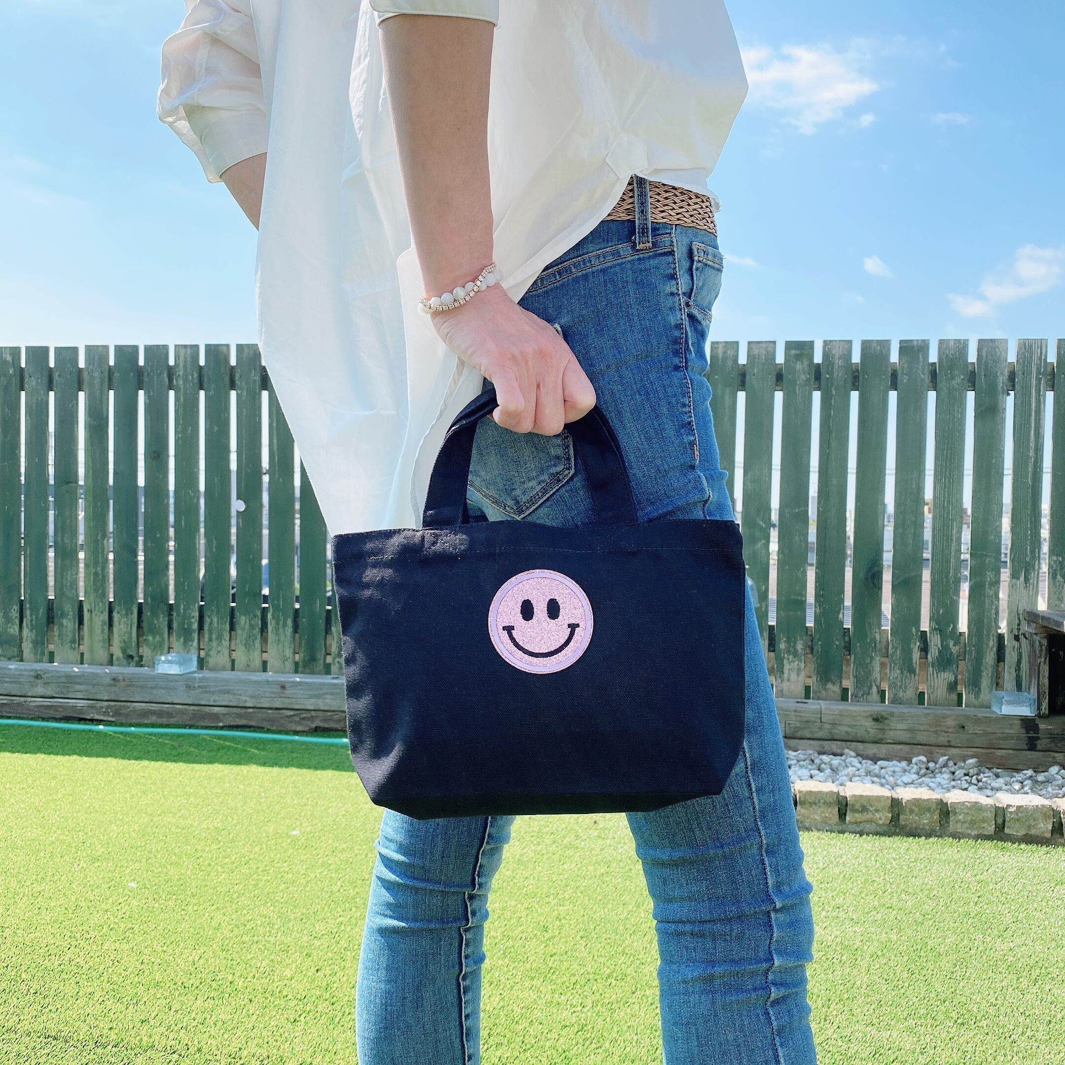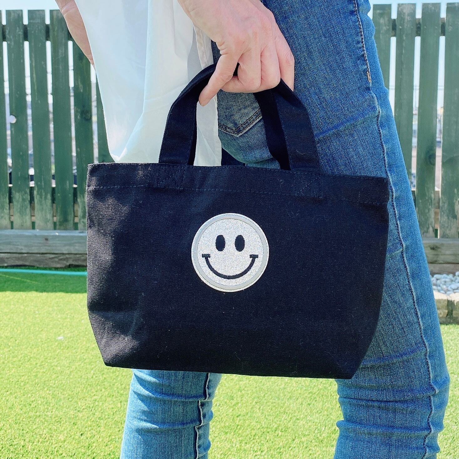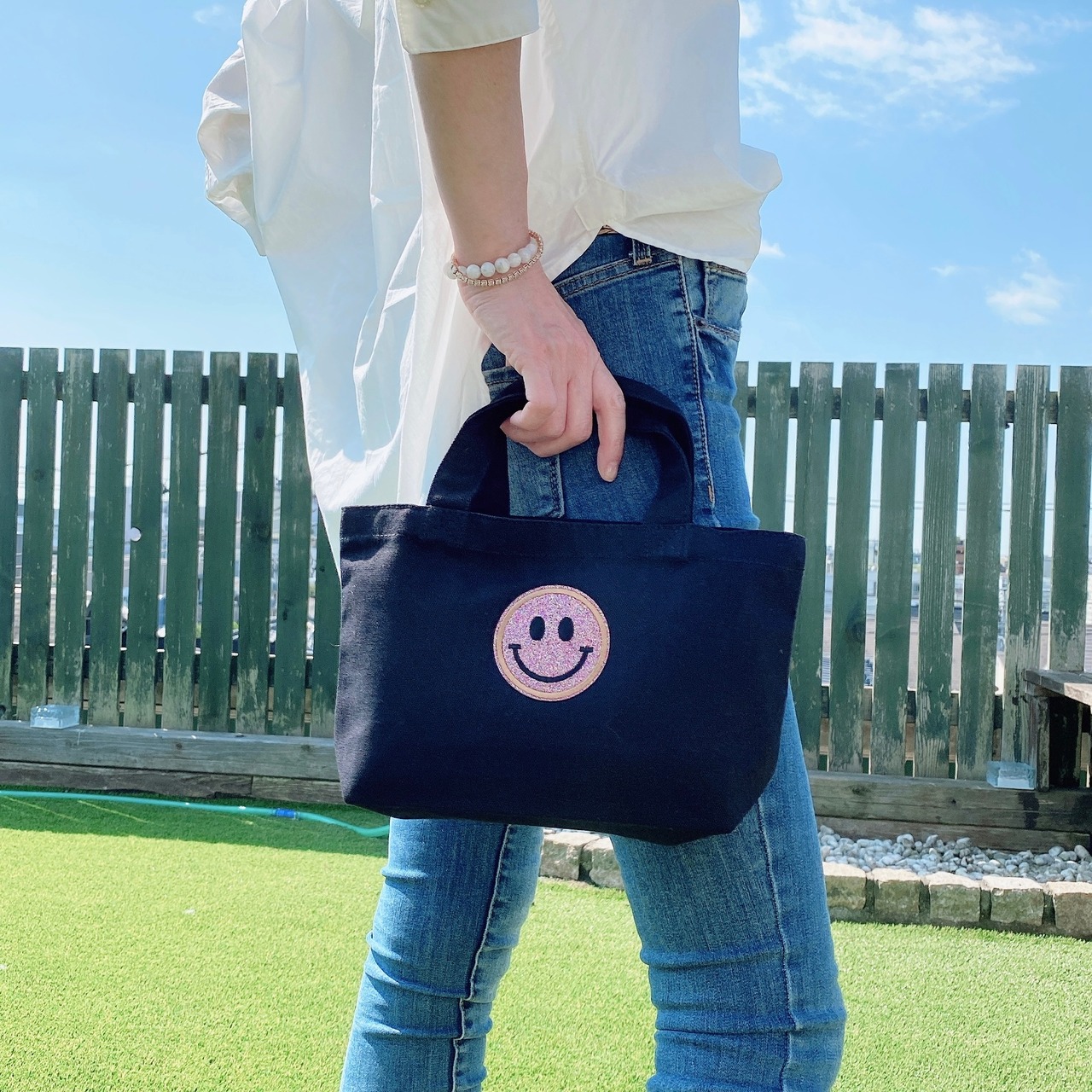 キラキラスマイルワッペンがついたカジュアルで可愛いミニトートバッグです。