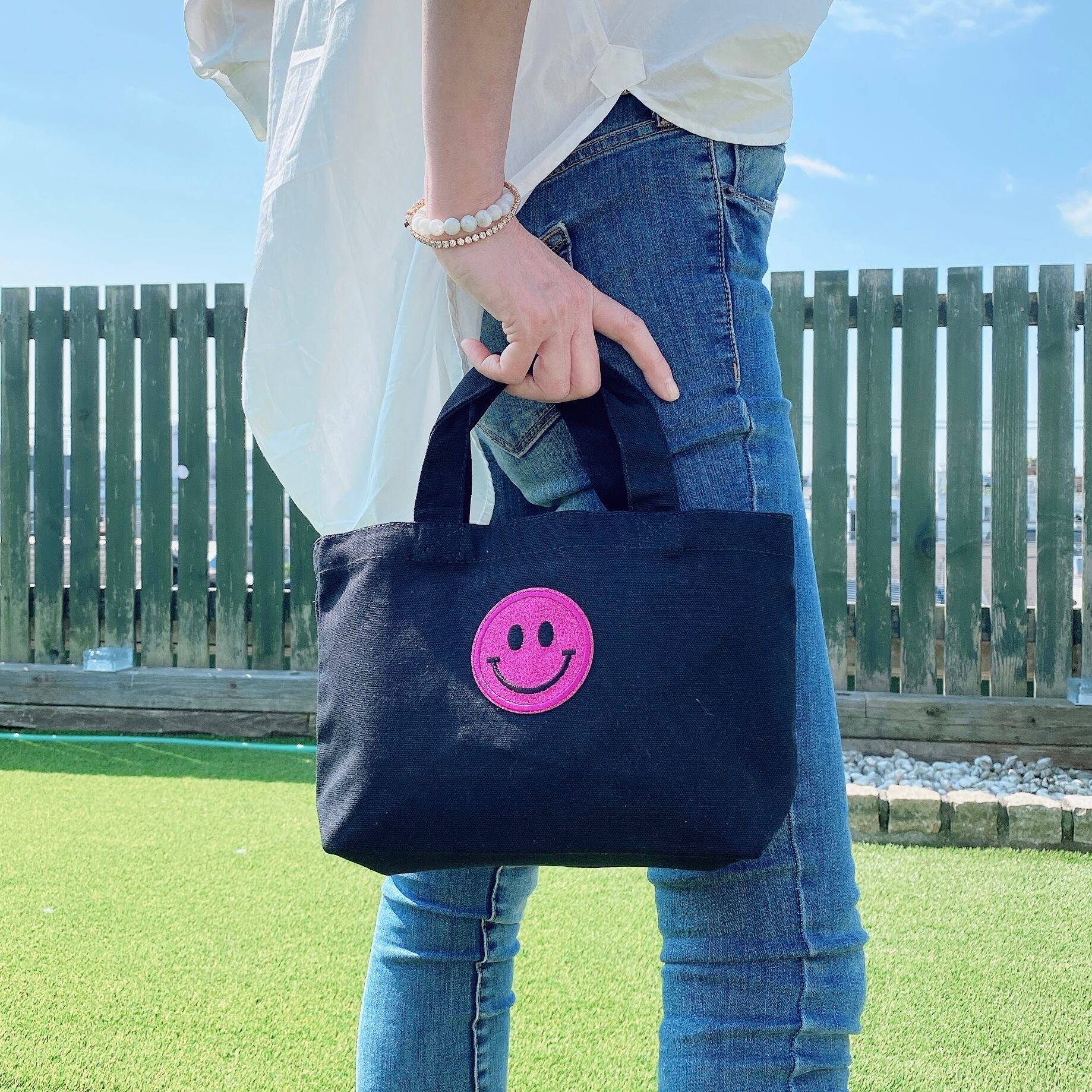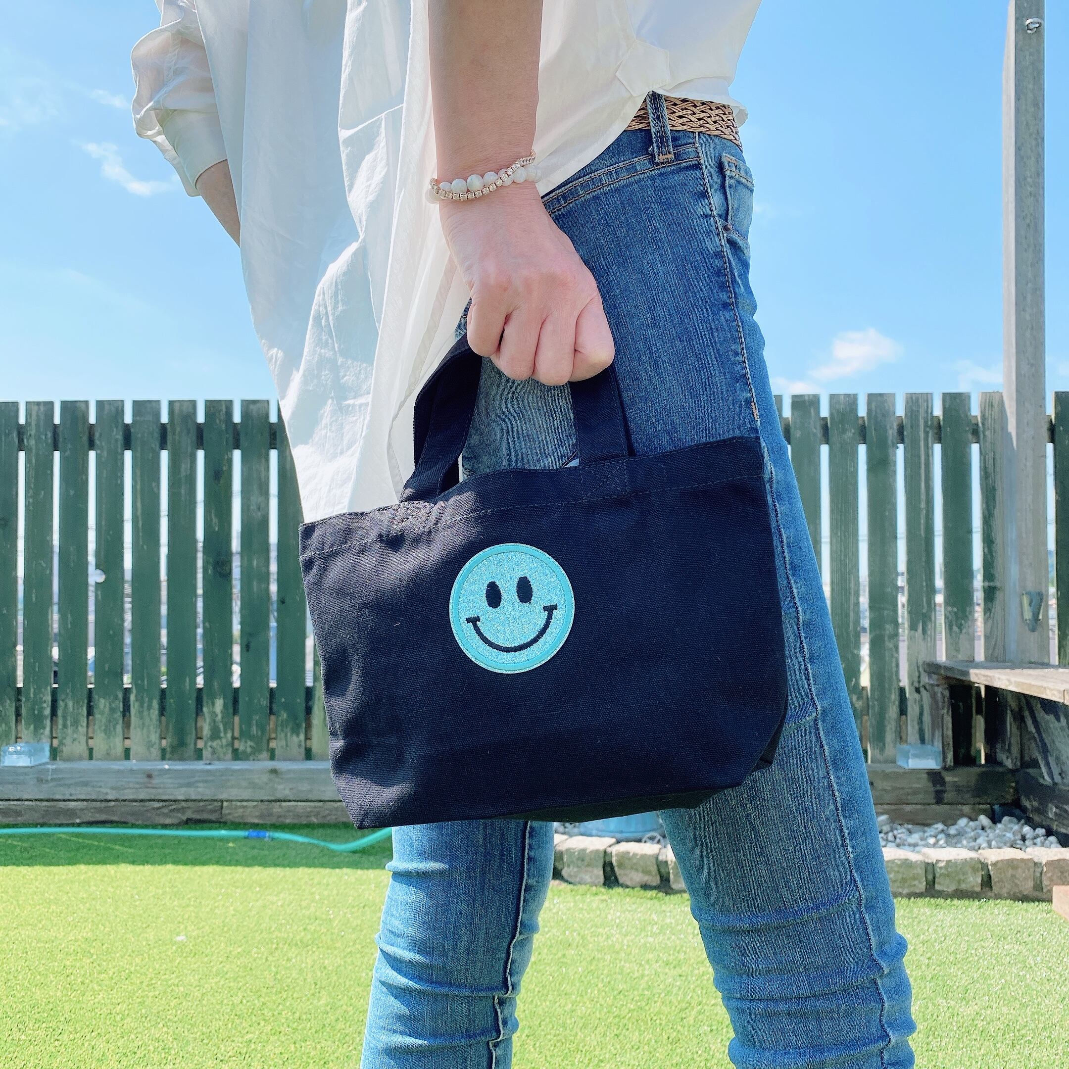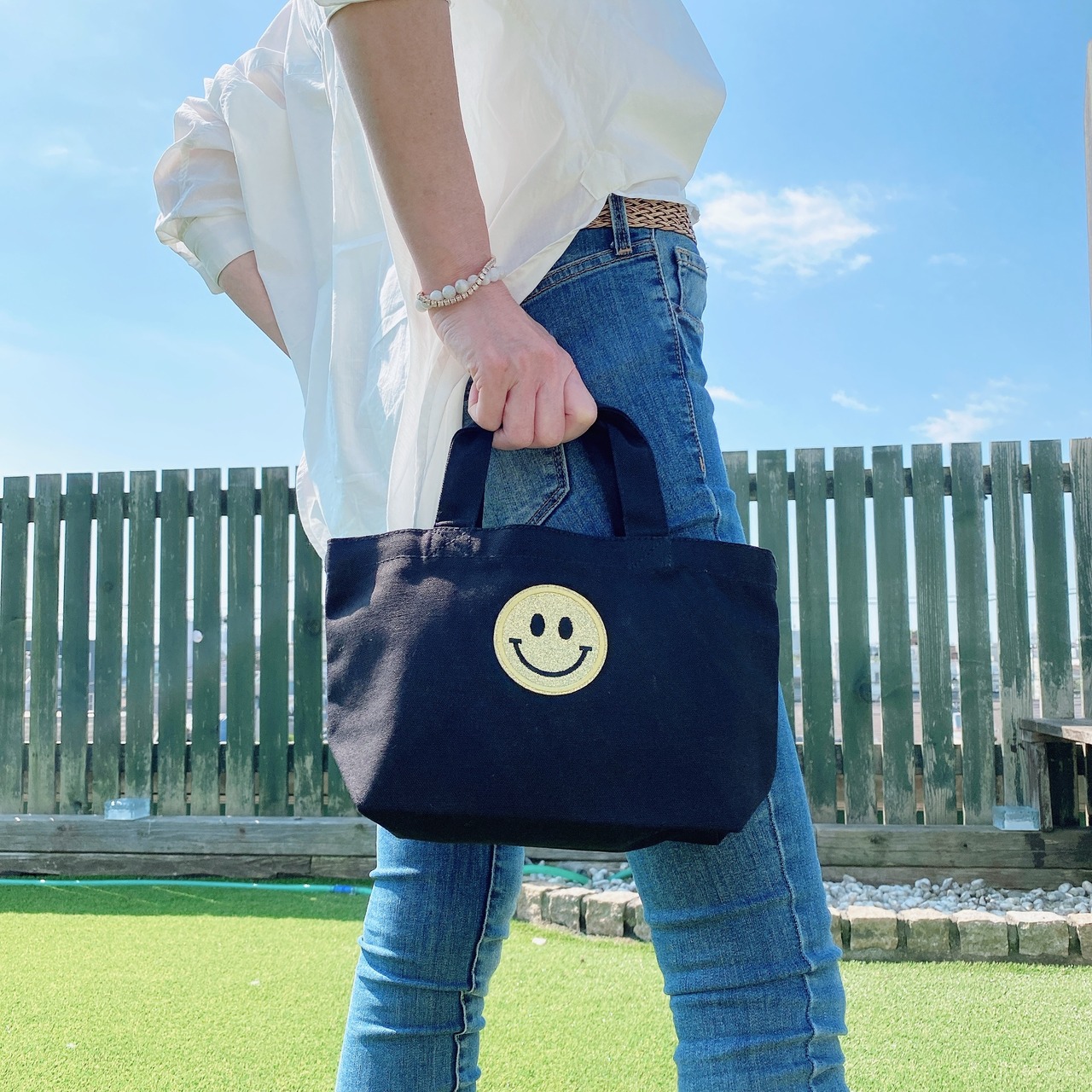 キラキラスマイルワッペンがついたカジュアルで可愛いミニトートバッグです。