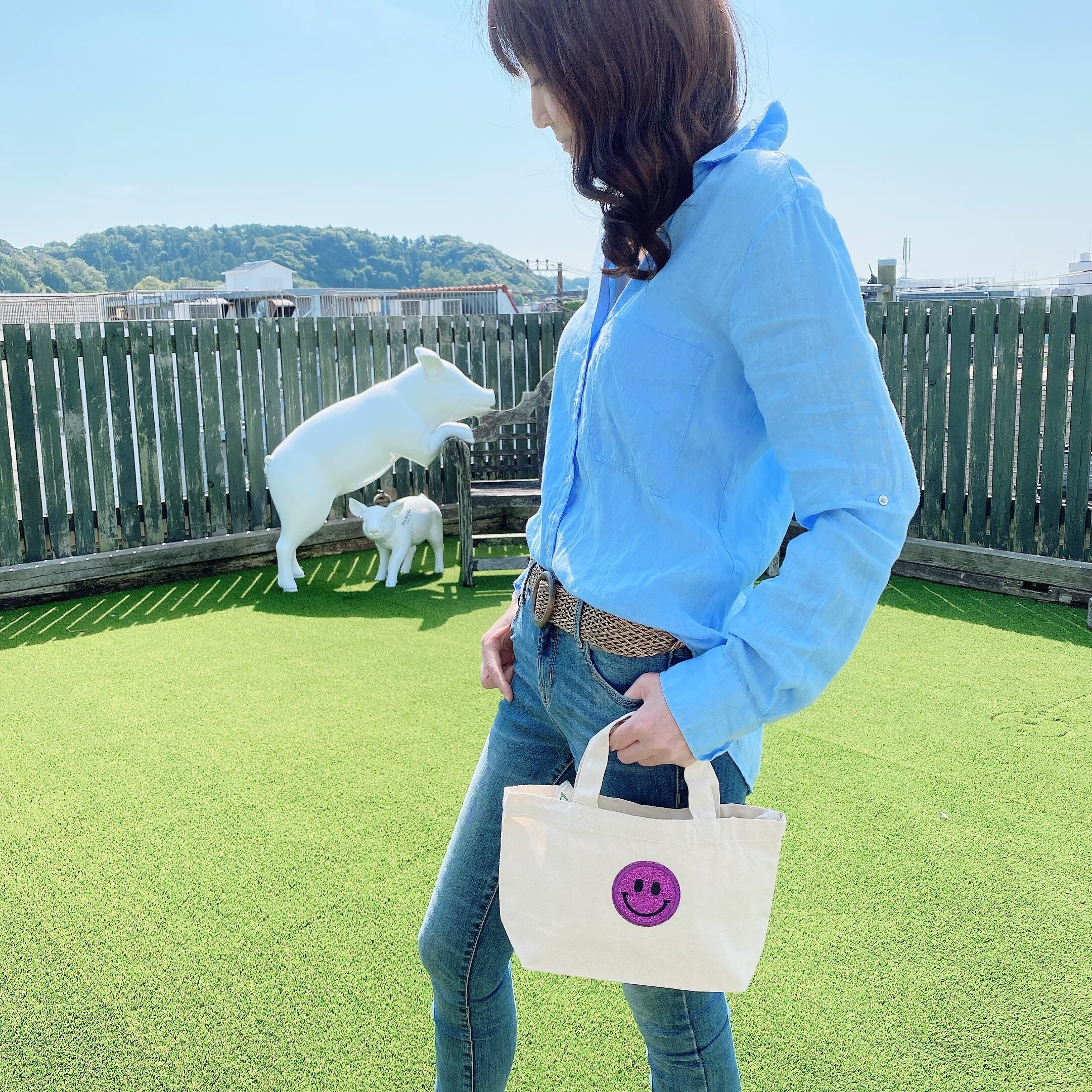 キラキラスマイルワッペンがついたカジュアルで可愛いミニトートバッグです。