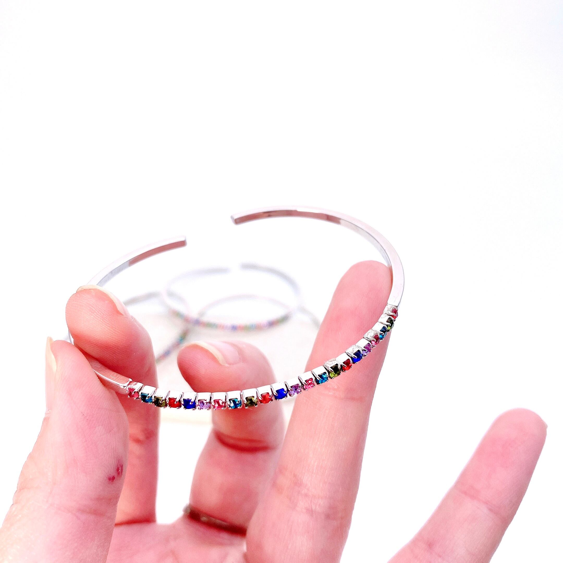 マルチカラーの小さなストーンが腕周りを控えめながらも可愛らしく演出してくれます。